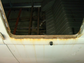 Here is the left rear window lower frame that has been quietly sitting in a puddle of rust for most of its' life. The pop out window seal perished a long long time ago and has allowed water to sit and fester.