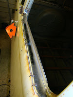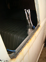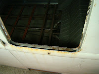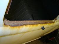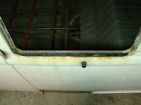 Here is the left rear window lower frame that has been quietly sitting in a puddle of rust for most of its' life. The pop out window seal perished a long long time ago and has allowed water to sit and fester.