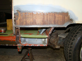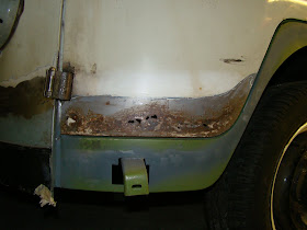 This is a more a picture than word post on how I repaired my cab door bottom. The rust has been hidden under a layer of filler and rattle can primer, and has kept well since I first covered it up 20 years ago.