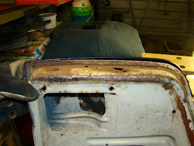 Here's the repair patch lined up on the outer skin of the door. And the rust hole that I didn't notice until the door was off.