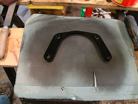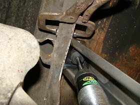 Then compressing the shock It all went Pete Tong (English rhyming slang my American friends). The body of the shock fouled on the back edge of the section, because as it moves up the lower mount also moves slightly back. After half an hour of huffing and fiddling I decided to cut away the fouling section to see where it should sit naturally. Getting a call from the house for Sunday dinner I've had to leave the problem there for now, and have passed the details on to my design consultants. Hope they come up with something, as I haven't got a clue what to do. Maybe I shouldn't have cut the original support out!